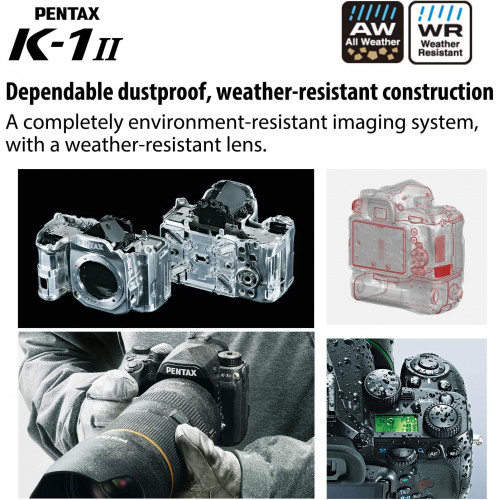 • Diseño resistente al polvo y a la intemperie: la combinación de 87 puntos de sellado de la k-1 Mark ii y el diseño resistente al agua de la empuñadura d-bg6 opcional previenen la entrada de agua y polvo en su interior