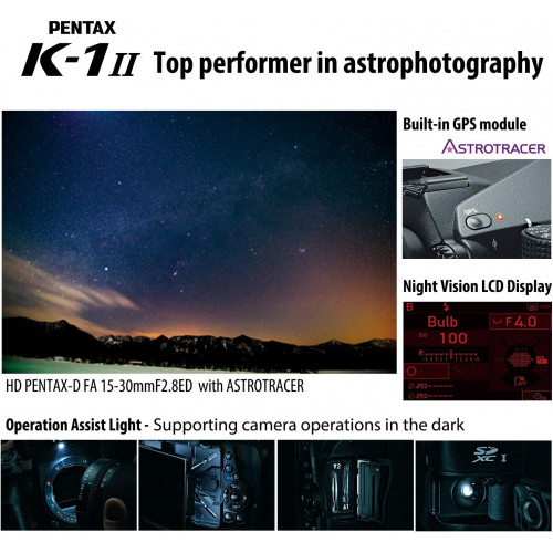 • ASTROTRACER: Gracias a su módulo GPS, Electronic Compass y mecanismo SR II, la K-1 Mark II simplifica la fotografía astronómica y hace posible captar imágenes de los cuerpos celestes sin necesidad de una montura ecuatorial