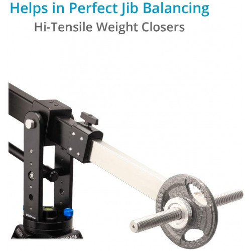 El brazo tiene un soporte de cabezal de cámara que acepta cabezales líquidos de 75 mm / 100 mm y tiene un ángulo de inclinación de 90 grados. El diseño de dos brazos proporciona mayor resistencia y estabilidad para todo el conjunto de la pluma. El brazo viene con perillas giratorias para controlar el giro del brazo. El nivel de burbuja integrado proporciona una configuración rápida y precisa en superficies irregulares. Montage-Hub proporciona la resistencia perfecta para un giro suave del brazo de la pluma y absorbe vibraciones o movimientos no deseados del operador. Las cerraduras de peso de alta resistencia mantienen las placas de peso intactas para un equilibrio perfecto.