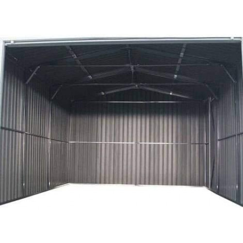 El garaje metálico Essex en color verde cuenta con vigas triangulares rígidas y robustas que refuerzan en gran medida la estructura y la estabilidad.