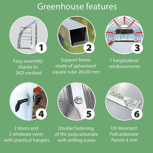 - INVERNADERO DURADERO: Hecho de fuertes perfiles de acero galvanizado y piso reforzado con adicionales puntales de pared y techo de acero que aseguran mayor estabilidad. Puede soportar condiciones climáticas extremas y temperaturas de -20 °C a 70 ° C y hecho de materiales resistentes a los impactos.
