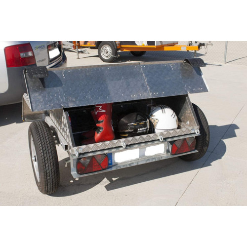 • El remolque para moto TRIAL ZERO de COMANCHE es para el transporte de 1, 2 y 3 motos de trial, enduro o motocross. El sueño de los amantes de la moto. Un remolque que incorpora una espaciosa caja de aluminio para poder transportar y guardar todos los elementos necesarios para la competición (casco, botas, herramientas, depósitos…) Las motos descansan sobre el chasis evitando la presión de las correas en los amortiguadores