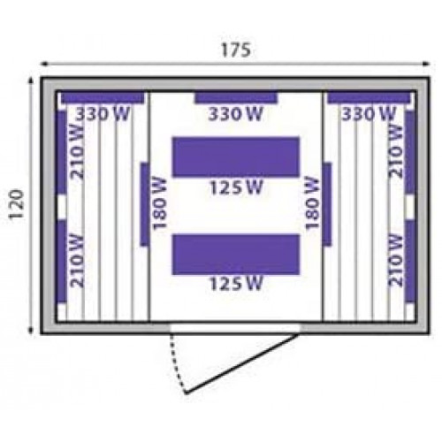 Este modelo es calefactado por un total de 11 radiadores de carbono de alta calidad, situados en las paredes de la sauna y en el suelo. Esta distribución proporciona un calor uniforme en todo el cuerpo. La sauna de infrarrojos se puede conectar a un enchufe de 230 V. La longitud de onda del foco infrarrojo es de 6-16 micras, lo que significa que la sauna de infrarrojos cumple con las normas más estrictas de la UE.