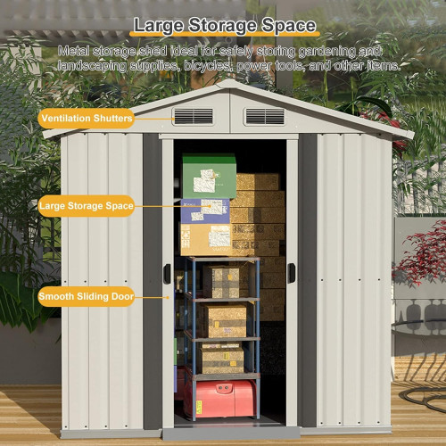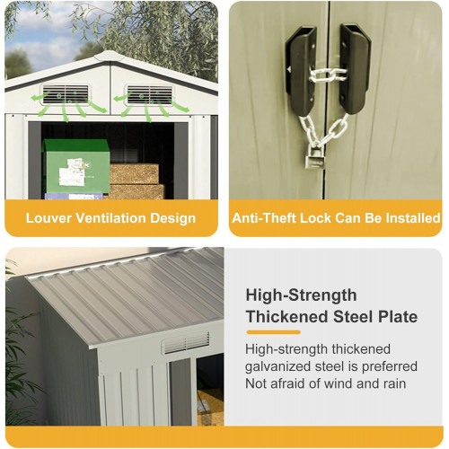 • 【Adáptese en todas las condiciones inclementes】Hecho de acero galvanizado para evitar la humedad y resistir el mal tiempo para un uso prolongado. El acero revestido es resistente a los rayos UV, lo que ayuda de manera efectiva a mantener su propiedad en buenas condiciones. Además, para propiciar la ventilación y el enfriamiento en la habitación, el almacenamiento del patio trasero proporciona un diseño de ventilación.