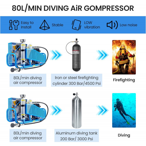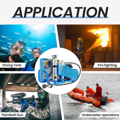 - Compresor de paintball: Ampliamente utilizado en buceo, extinción de incendios, construcción al aire libre, soldadura de tuberías, soldadura de contenedores, investigación científica y pruebas de presión, y laboratorio, también se puede utilizar en tanques de paintball rifle PCP.