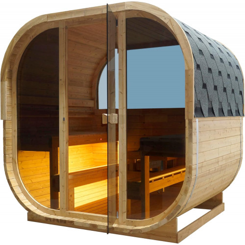- Contenido del envío: sauna de barril, techo de asfalto, estufa de sauna, cubo de sauna, creador, termómetro, reloj de arena, piedras para sauna. Por lo tanto, todo lo que se necesita para una experiencia de sauna inolvidable está a mano.