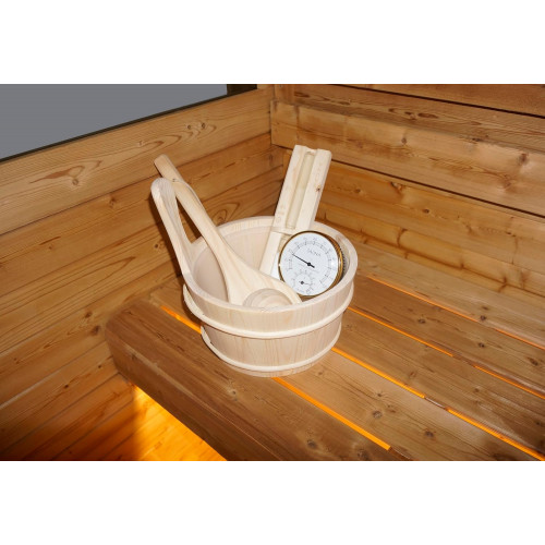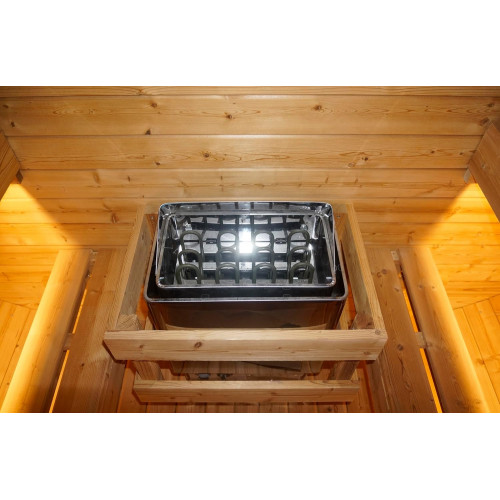 - Horno de sauna con piedras de sauna: el horno de sauna con una potencia de 8 kW calienta la sauna de forma rápida y eficaz y ofrece suficiente calor para una experiencia de bienestar relajada. Las piedras de sauna suministradas proporcionan calor adicional y, por lo tanto, aumentan el efecto de sauna.
