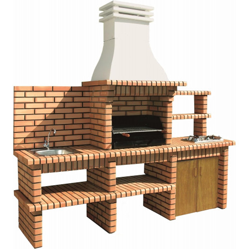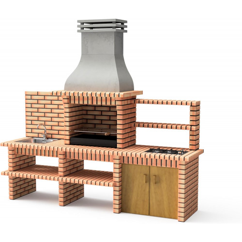 • Barbacoa de obra MOVELAR modelo Luxor Royal REF: 3521/1 fabricada en hormigón refractario gris y ladrillo naranja. Incluye parrilla zincada de 76,5x44 cm, rejilla metálica de 70x40 cm con cajón recogecenizas, fregadero de acero inoxidable con grifo cromado y soporte lateral con placa de cocción Teka EFX 30.1 2G AI AL CI. Puertas de madera exótica y estantes de ladrillo. Ideal como cocina de exterior completa. Capacidad para hasta 9 personas. Robusta y funcional.