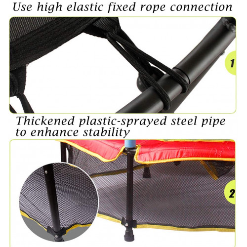 • Buena elasticidad: este trampolín está conectado con 30 cuerdas elásticas de alta resistencia, lo que minimiza el ruido, la almohadilla de salto resistente al desgaste y a los rayos UV (hecha de PP) puede soportar alta presión.