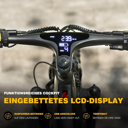 • Pantalla más moderna y fresca: a diferencia de las pantallas tradicionales, la pantalla de la bicicleta de montaña Fafrees F26 CarbonM E está insertada y la moda y la elegancia también se pueden integrar en las bicicletas. Puedes ver tu velocidad, rango, potencia, nivel de batería y mucho más. El puerto USB te permite cargar tu teléfono mientras conduces. Cuenta con un asistente de arranque o ayuda de deslizamiento y función de control de crucero para ayudarle cuando lo necesite.