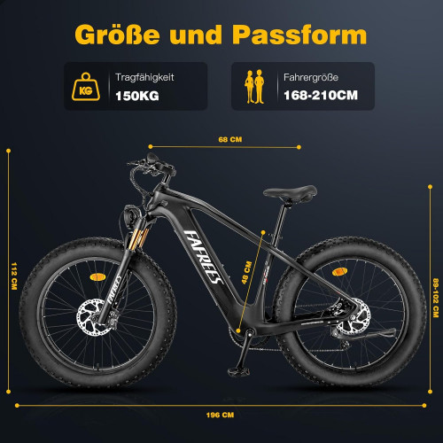 • Motor sin escobillas de alta velocidad: Fafrees F26 CarbonM Fatbike Ebike está equipado con un motor sin escobillas de alto rendimiento y máx. 95N.m, la capacidad cuesta arriba es más fuerte, hasta 30°, equipada.