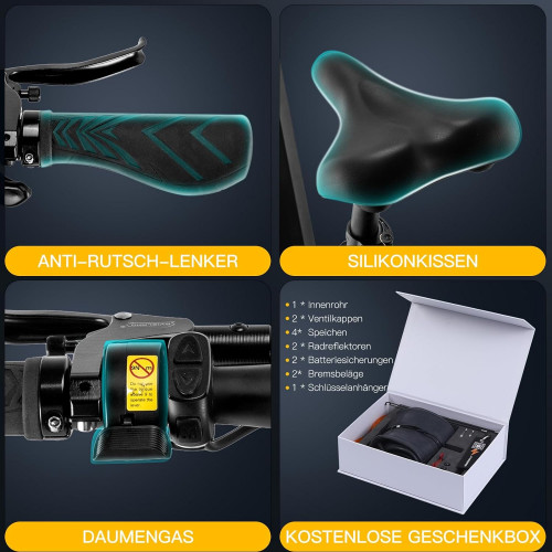 • Diseño más amigable y seguro: la enorme luz frontal de 48 V 5,5 W es un 20 % más brillante que las luces LED convencionales. La visibilidad mejorada garantiza tu seguridad al conducir por la noche. El sillín de silicona tiene un diseño que alivia la presión que es cómodo y ergonómico. Un viaje de larga distancia seguro y agradable.