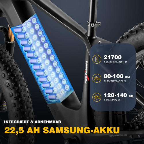 • 【Batería de 48 V 22,5 Ah con celda Samsung】La bicicleta eléctrica Fafrees F26 CarbonM para hombre con batería de 1080 Wh aumenta eficientemente el alcance de hasta 140 km y garantiza su largo viaje y desplazamientos al trabajo. El diseño integrado reduce el riesgo de cortocircuitos y problemas de humedad y proporciona una experiencia de conducción segura y confiable.