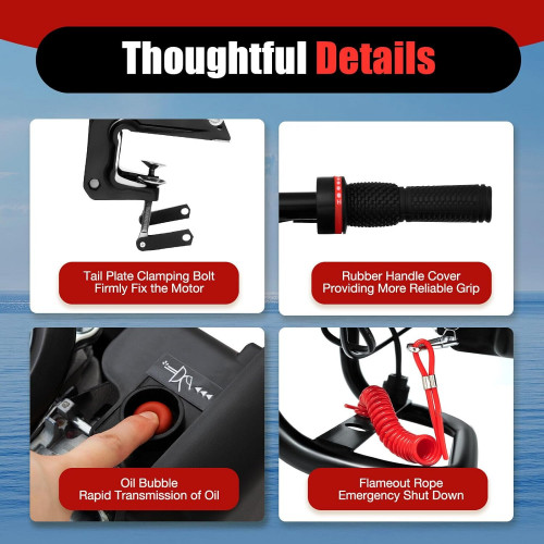 • SEGURIDAD Y PROTECCIÓN: El confiable sistema de encendido TCI para un arranque rápido y seguro del motor, los pasadores de ajuste de inclinación suspendidos y las placas antivórtices reducen la inclinación y los vórtices para garantizar un funcionamiento suave. Los eficientes disipadores de calor y la protección contra sobrecalentamiento te permitirán navegar y disfrutar del viaje.