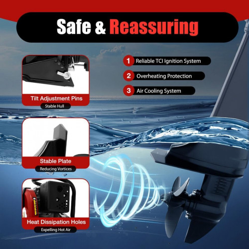 • SEGURIDAD Y TRANQUILIDAD: El confiable sistema de encendido TCI para un arranque rápido y seguro del motor, los pasadores de ajuste de inclinación suspendidos y las placas anti-vórtice reducen la inclinación y el vórtice para un funcionamiento suave. Los eficientes disipadores de calor y la protección contra sobrecalentamiento le permitirán disfrutar de su viaje.