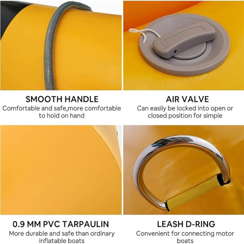 - Remolque seguro con asas resistentes: equipado con 2 fuertes anillos en D de acero inoxidable en la cabeza para una conexión segura de la cuerda y asas resistentes para subir fácilmente, lo que hace que el remolque de agua sea cómodo y fiable.