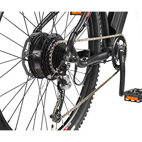 - Comodidad: el sillín deportivo MTB con tija de sillín de aluminio y el manillar MTB con puños ergonómicos hacen que la bicicleta eléctrica sea ideal para terrenos y los frenos de disco mecánicos garantizan la seguridad