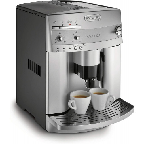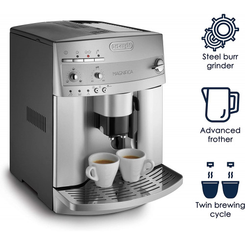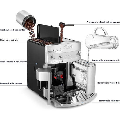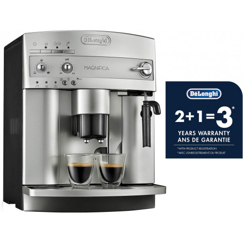 - Capaz de preparar espresso, café, capuchino, bebidas con leche y más, esta máquina súper automática cuenta con un sistema único de granos para preparar granos de café justo antes de preparar un espresso excepcionalmente aromático. El aparato viene equipado con dos calderas de acero inoxidable que proporcionan una excelente distribución del calor, así como una función de recalentamiento instantáneo, que mantiene la máquina a una temperatura ideal, sin importar cuánto tiempo sea el intervalo entre tazas. Además, su molinillo silencioso muele automáticamente los granos y se puede ajustar a un nivel de molienda específico, pero la unidad también se puede utilizar con café molido si lo prefiere. El panel frontal de la unidad ofrece controles de fácil acceso para el interruptor de encendido/apagado y el sistema de capuchino, así como para ajustar la cantidad de agua y café para adaptarse a gustos individuales, desde largo o corto a débil o fuerte. Su sistema patentado de capuchino gira 180 grados para permitir cualquier tamaño de recipiente de leche, además de la altura de la espiga de café se puede ajustar para adaptarse a todos los diferentes tamaños de taza, desde una taza clásica de espresso hasta una taza alta. Aún más, la exclusiva bandeja de tazas mantiene las tazas calientes antes de su uso, y su apagado automático de tres horas proporciona mayor seguridad. Otros aspectos destacados incluyen un tanque de agua extraíble de 60 onzas, un práctico indicador de nivel de agua, un recipiente de granos de 7 onzas, un termostato electrónico de vapor y café, programas de enjuague y descalcificación automáticos, y una bandeja de goteo extraíble para una fácil limpieza. Fabricado en Italia. Del fabricante Capaz de preparar espresso, café, capuchino, bebidas con leche y más, esta máquina súper automática cuenta con un sistema único de granos para preparar granos de café justo antes de preparar un espresso excepcionalmente aromático. La máquina hace espresso a una temperatura consistentemente ideal debido a su nueva caldera doble de acero inoxidable, que proporciona una excelente distribución del calor, así como su función de recalentamiento instantáneo, que mantiene la máquina a una temperatura ideal, sin importar cuánto tiempo sea el intervalo entre tazas. Su molinillo de rebabas integrado que ahorra espacio muele automáticamente los granos y se puede ajustar a un nivel de molienda específico, pero la unidad también se puede utilizar con café molido si lo prefiere. Su depósito de agua extraíble de 60 onzas y recipiente de granos de 7 onzas permiten llenar cómodamente el tanque de agua y vaciar café molido. El panel frontal de la unidad ofrece controles de fácil acceso para el interruptor de encendido/apagado y el sistema de capuchino, así como para ajustar la cantidad de agua y café para adaptarse a gustos individuales, desde largo o corto a débil o fuerte. El sistema patentado de capuchino de la máquina gira 180 grados para permitir cualquier tamaño de recipiente de leche, mientras que su altura de espiga de café se puede ajustar para permitir todos los tamaños de taza diferentes, desde una taza de espresso clásica hasta una taza alta. La unidad cuenta con una exclusiva bandeja para tazas para mantener las tazas calientes antes de su uso, así como un apagado automático de tres horas para mayor seguridad. Para mayor comodidad, la unidad viene con un indicador de nivel de agua, un termostato electrónico de vapor y café, programas automáticos de enjuague y descalcificación, y una bandeja de goteo extraíble para una fácil limpieza. Unidad de preparación: El "corazón" de Magnificent The Magnifica cuenta con el sistema de preparación extraíble más pequeño disponible en el mercado. Porque la caldera patentada DeLonghis es tan compacta. Y, gracias a la caldera extraíble, limpiar el interior de la máquina es fácil. Incluso las zonas normalmente difíciles de alcanzar se pueden limpiar fácilmente y sin el uso de detergentes agresivos. Y debido a que el mantenimiento regular ayuda a prolongar la vida útil de la máquina, la fiabilidad de DeLonghis es insuperable. Sistema de granos a preparación. Uno de los secretos para hacer un espresso de alta calidad es usar granos de café recién molidos. Debido al sistema de granos a preparar, el Magnifica te ofrece café que tiene un delicioso aroma. El café está recién molido y no deja rastros en la máquina. Magnifica es la única máquina súper automática que ofrece los resultados más frescos. Características compactas y de alto rendimiento: porque la nueva caldera patentada DeLonghis es tan compacta. Fiabilidad atemporal: gracias a la caldera doble extraíble de acero inoxidable, el interior se puede limpiar fácilmente. La limpieza regular de la máquina es esencial para mantener el mejor sabor posible y para minimizar la necesidad de servicio. Un aroma perfecto. No se dejan rastros de terrenos rancios en la máquina. Recalentamiento instantáneo: esta función especial calienta el núcleo de Magnifica, asegurando que la máquina esté siempre a la temperatura ideal para espresso, sin importar cuánto tiempo sea el intervalo entre tazas. Depósito de agua extraíble y contenedor de frijoles: Magnifica sabe que el espacio en la encimera de tu cocina siempre es premium. Magnifica es la única máquina súper automática que te permite llenar el tanque de agua y vaciar los granos de café sin mover la máquina. Todos los controles están en la parte delantera de la máquina, desde el interruptor de encendido/apagado hasta el sistema de capuchino. Molinillo de rebabas integrado: un recipiente que ahorra espacio para granos está totalmente integrado en el Magnifica. Puedes establecer el nivel de molienda para personalizar tu espresso. Magnifica también se puede utilizar con café molido. DeLonghi recomienda el uso de illycaffe para el mejor sabor de espresso. Rico, s