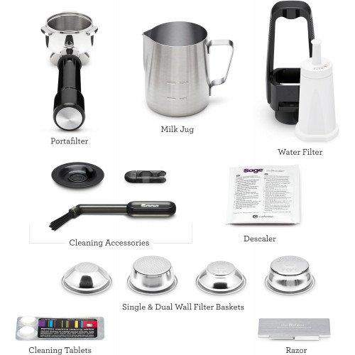 | Componentes incluidos | Portafiltros de acero inoxidable de 54 mm, jarra de leche de acero inoxidable de 480 ml, cestas de filtro de doble pared para 1 y 2 tazas, soporte para filtro de agua con filtro, tiras de agua, herramienta de recorte de precisión Razor™, pastillas de limpieza, herramienta de limpieza de boquillas de vapor, disco de limpieza, cepillo de limpieza, polvo descalcificador |