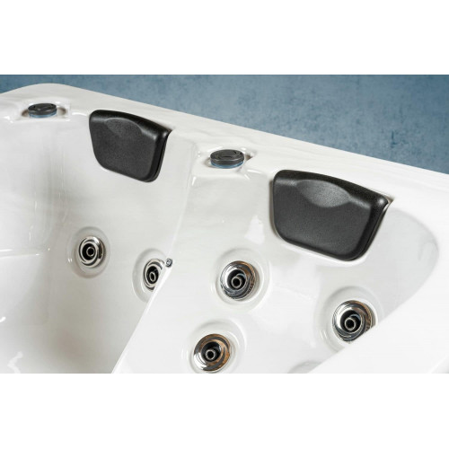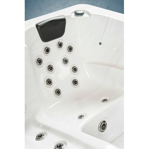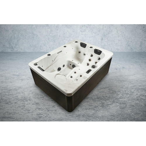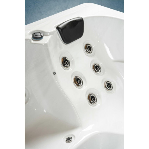 - Bañera exterior para 3 personas con 2 asientos, 1 superficie de descanso y 33 chorros de masaje para una experiencia de relajación total.