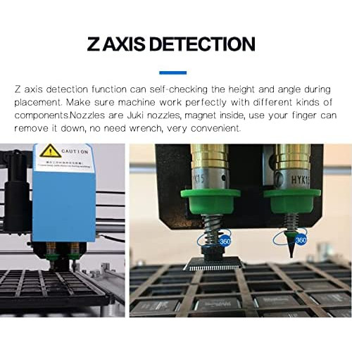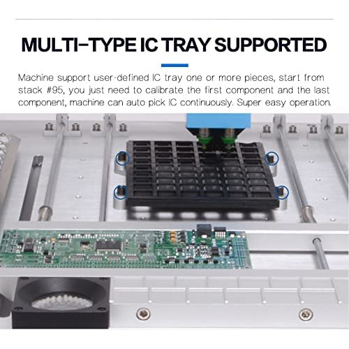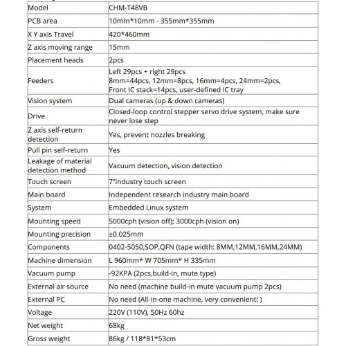 La máquina está completa, lista para trabajar, cada máquina será 100% probada bien, control de calidad aprobado. Compra con confianza. Garantía de calidad, la calidad es mejor que otras máquinas de marca. Descripción: Este CHMT48VB es una versión actualizada de CHMT48VA, que incluye alimentadores laterales dobles con un total de 58 piezas (izquierda 29 piezas + derecha 29 piezas). Es una máquina todo en uno, no necesitas comprar ninguna otra pieza para conectar con la máquina, puedes usarla cuando recibas la máquina, está lista para funcionar. El sistema operativo es el mismo que CHMT48VA y puede instalar más tipos diferentes de materiales, utilizando 502---507 tipos diferentes de boquillas Juki, adecuado para 0402,0603,0805-5050, SOP, QFN, LQFP144, diodo, transistor, BGA... etc., que puede satisfacer la demanda de más clientes. Obtendrás de este enlace: 1) Pick and Place MachineCHMT48VB: 1 2) Alimentador de vibración: 1 pieza 3) Boquilla Juki total 4 piezas (503, 504, 505, 506 tamaño) 4) Controlador USB 8G 1 5) Cable de alimentación 1 6) Aguja de tracción 2 7) Bobina para pin 1 8) Ajuste de posicionamiento de cámara tablero negro ) Llave hexagonal 6 10) Pinzas 1 11) Cepillo 1 12) Bolígrafo para pantalla táctil 1 13) Accesorio para bandeja IC 4 14) Grasa 1