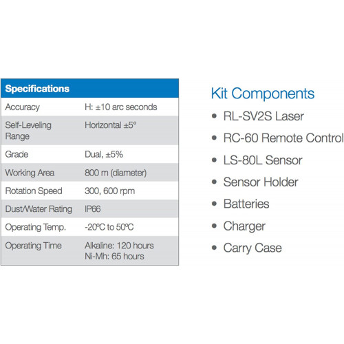 • Fácil de usar: Con electrónica autonivelante, pulsa el botón de encendido e ir derecho a trabajar en cuestión de segundos. Si el RL-SV2S se perturba en el trabajo que relevels automáticamente. Los motores autonivelantes son exactos a  ± 10 segundos de arco en ambos ejes.