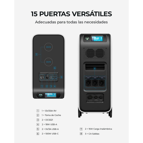 - [15 Puertos Versátiles] - Un puerto RV de 12V/30A para vehículos móviles, cargador inalámbrico de 15W y puertos más versátiles como 3000W AC/100W USB-C/36W USB-A/DC 5521.