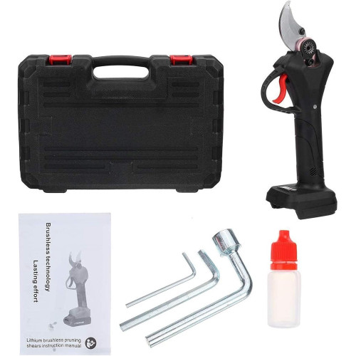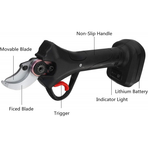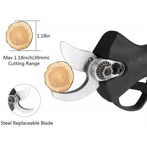 - <b>Más profesional</b>: tijeras inalámbricas profesionales forjadas en acero con alto contenido de carbono SK5. Este material es muy duradero y permite cortar fácilmente ramas de 30 mm. La máquina de podar es impulsada por un motor sin escobillas, y la vida útil del motor sin escobillas es de 3 a 5 veces mayor que la del motor con escobillas tradicional.