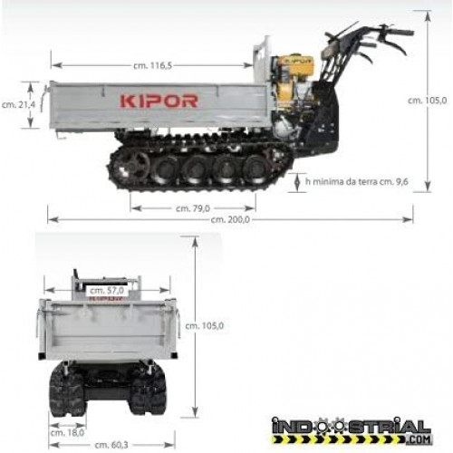 Tipo de motor: 4 T. KIPOR OHV. Modelo: GK205 Potencia (HP): 6,50. Arranque: Manual autoenvolvente. Carga máx. (Kg): 500. Capacidad del depósito (L): 3,6. Marchas: Adelante (1 lenta /1 rápida) y Atrás (1 lenta/ 1 rápida). Velocidad máx. (km/h): 4,8 Pendiente máx.: > 20 º (15º plena carga) Caja Extensible: si. Dimensiones caja L x W x H (mm): 1120 x 520 x 210. Dimensión minidumper L x W x H (mm): 2000 x 605 x 1100. Peso del minidumper (Kg): 180 Ancho de oruga: 180. Altura del manillar: 890 mm. Distancia entre ruedas oruga: 240 mm.