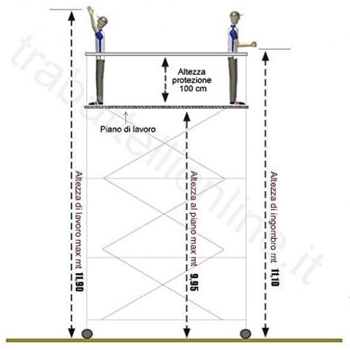 Accesorios: 4 niveladores eco – Composición: completo (norma UNI EN 1004) – El andamio metálico 6 es adecuado y fabricado para los profesionales que necesitan realizar trabajos a altas alturas y no pero con la máxima seguridad y establecida. El andamio Metal 8 está fabricado en acero galvanizado con escalones y horizontales en tubo de 40 x 15 x 1,5 mm. Postes de 40 x 1,5 mm. Con conectores de 48 x 3 mm y diagonales de acero galvanizado de 20 x 1,5 mm. Tiene una dimensión de base de 2,00 x 1,10 m y tiene una altura de espacio que varía de 2,70 m a máximo 18,30 m. La base está compuesta por 4 ruedas giratorias de 200 mm con freno de estacionamiento, i. A diferencia del modelo Metal 5 que puede parecer similar al andamio m6 y estructuralmente más pesado en términos de peso, los elevadores son de 1.20 por lo que son más pequeños que el modelo de metal 5 adecuado para facilitar el montaje y no hacer que el peso de la estructura sea un endicap. Incluso las horizontales son dobles en comparación con el metal 5, esto es aún más establecido. Se identifica en la plataforma Metal 6 quien en los artículos busca la robustez de un tiempo y que hasta ahora ya no se encuentra más. Las ruedas tienen una capacidad de carga de 300 kg. Cad. Capacidad tanto estática como movimiento: La barandilla y la base están previamente galvanizadas y posteriormente pintadas con polvo de poliéster para una protección contra el óxido duradera en el tiempo. Composición: base de 2,00 x 1,14 m. La base está compuesta por 4 ruedas giratorias con freno de 200 mm de diámetro montadas en estructura cuadrada de 50 x 50 mm + 2 horizontales de conexión. Elevación: Los soportes están compuestos. y de 2 tirantes + 2 horizontales de conexión y 4 diagonales de refuerzo. Terminal: la barandilla está compuesta por 2 respaldos laterales + 2 horizontales terminales y 4 diagonales de contramachado. Dimensiones y dimensiones de la estructura: 11,10 m. Altura máxima: 11,90 m. Altura máx. en el plano 9,95 m. Anchura de la base: 1,14 m. Longitud de la base: 2,00 m. Peso: 90 kg. Composición estándar