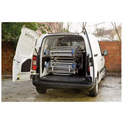 - Montaje en seguridad: 2 garde-corps monoblocs plegables; Rodapiés plegables integradas en el suelo. – 4 estabilizadores plegable ajustable al mm cerca. – Suelo a puerta antideslizante espacioso: plegable en 2 y regulable en altura los 25 cm. – echafaudage ultra compacto para llevar en un vehículo. – Viajes fáciles gracias a 4 ruedas Ø 150 mm (ajustables individualmente en 175 mm). – Echelles laterales equipadas con un dispositivo de acero con retorno automático. Perfil – al suelo fuera todo de la necesitan escaleras ni con estabilizadores: 2.05 x 1.70 m