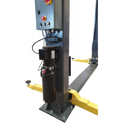 El elevador de coches cumple con la Directiva 2006/42/EC y contempla los últimos estándares requeridos como es el EN 1493:2010. Diseñado tomando como base los estándares de calidad y funcionamiento, para satisfacer los requerimiento necesarios de cualquier garaje o taller. Sistema de seguridad electromagnético automático dotado con dos puntos de anclaje en cada columna. Impulsado por dos cilindros hidráulicos. Panel de control eléctrico completamente automático. Sistema de alzado por cable de seguridad. Sistema automático de anclaje de seguridad de los brazo. Cable de acero para mayor estabilidad de los brazos del equipo. Disponible en 380 V (trifásico) y 220 V (monofásico) en función de la demanda del cliente. Pintura con acabado resistente a la corrosión. Normativa y homologaciones europeas.