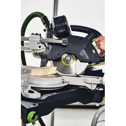 Movilidad, versatilidad de uso y los mejores resultados - una combinación perfecta. Máxima precisión: el guiado de doble columna de Festool garantiza que la hoja de sierra se guíe de forma suave y segura. Trabajo limpio también con piezas de trabajo largas: gracias a la mesa extraíble. Tiene un gran sistema: el pie central eleva la altura de la mesa de la KS 60 hasta llegar a la de una SYSTAINER SYS 1 T-LOC y una Classic. De esta forma, las piezas grandes quedan fijas de manera segura y se pueden mover gracias al bastidor UG-KAPEX. Es un bastidor fijo que sirve para el transporte y tiene una barrera con tapa para favorecer una elaboración rápida de ranuras sin contaminar el aire ni el entorno de trabajo. El dispositivo de aspiración aspira junto con el sistema móvil de Festool para eliminar el polvo. De esta forma, la máquina siempre está preparada para el trabajo. La hoja de sierra Festool es ideal para KAPEX KS 60 y para el trabajo con diferentes materiales. También es ideal para aplicaciones móviles en el montaje de tablas y paneles de hasta 305 x 60 mm, tapas de listones, perfiles y maderas escuadradas de hasta 60 mm de espesor. Tiene un encaje en ángulo preciso del soporte y de los listones que no requiere cálculos. Además, cuenta con una escuadra. Datos técnicos: potencia: 1200 W. Par: 1300 - 3500 mín. diámetro de la hoja de sierra: 216,00 mm. Profundidad del corte: 90° / 90° 305 x 60 mm. Profundidad del corte: 45° / 90° 215 x 60 mm. Profundidad del corte 45° / 45° (izquierda) 215 x 40 mm. Grado de inclinación 47 / 46°. Ángulo oblicuo: 60 / 60°.