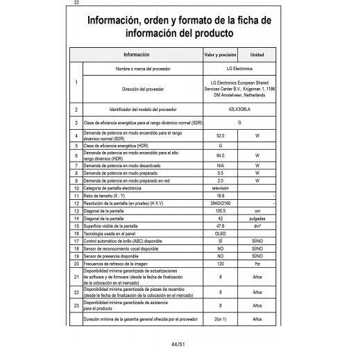 • TV de 42" (106cm) 4K OLED EVO Flexible (20 posiciones) con ajuste de altura. SmartTV WebOS 22 con Control por Voz Sin Mando, TV Always Ready, Asistente de Google Integrado, Asistente ALEXA Integrado, Funciona con Apple Home Kit, Airplay 2, Screen Share, Navegador Libre, WiFi (802.11ac), Magic Remote Incluido MR22. IMAGEN Y SONIDO: Procesador Inteligente α9 Gen5 AI Processor 4K, Modo Autogénero (SDR/HDR/Dolby HDR), Dynamic Tone Mapping Pro (Analiza por separado 5.184 Areas de cada Imagen) Pixel Dimming, 33 Millones de puntos de luz independientes, 100% Fidelidad de Color, 100% Volumen de Color, HDR Dolby Vision IQ, HDR 10 Pro, HLG Pro, HDR Effect, Modo Director (FILMMAKER), 4K/2K HFR 100fps (RF/HDMI/USB). Sonido DOLBY ATMOS, 40W (WF:20W, 10W Por Canal), 2.2 ch, AI Sound Pro (Sonido Virtual 7.1.2 Up-mix), Compatible: WiSA 2.1ch. FUNCIONES GAMING: nVidia G-Sync, AMD Freesync, VRR, ALLM (Modo automático de Baja Latencia), HDR HGiG, Cloud Gaming Stadia / GeForce. CONECTIVIDAD: Sint. Terrestre/Satélite/Cable DVB-T2/S2/C, 4XHDMI, 4XUSB 2.0, Salída Óptica, Bluetooth (V5.0). Eficiencia Energética: (W) en SDR y (W) en HDR.