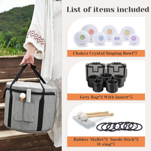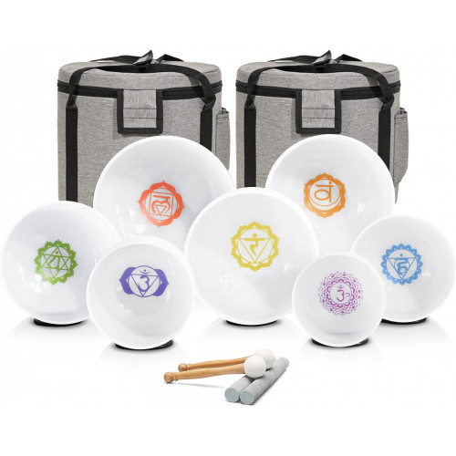 - El artículo incluye: 7 cuencos de cristal con diseño de símbolo de chakra de 432 Hz de 7 a 12 pulgadas (12 pulgadas C 11 pulgadas D 10 pulgadas E 9 pulgadas F 7 pulgadas G 8 pulgadas A 7 pulgadas B), 2 bolsas de transporte, 2 mazos de gamuza, 2 mazos de goma, 7 juntas tóricas de goma