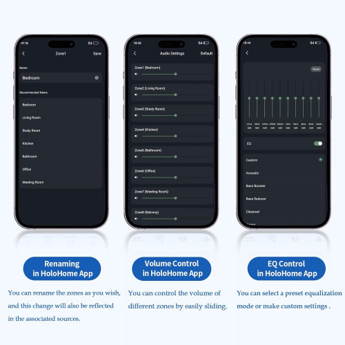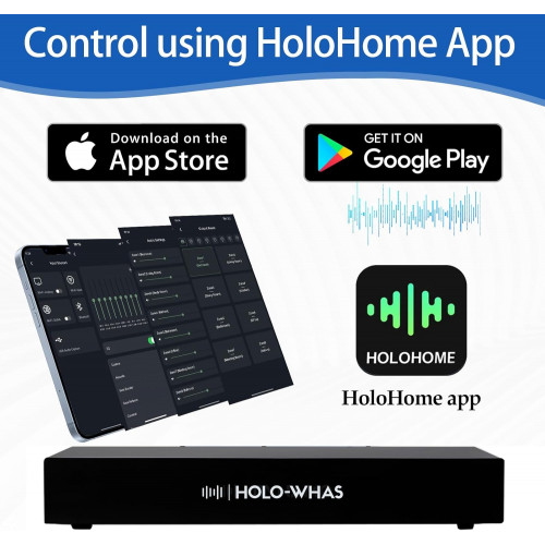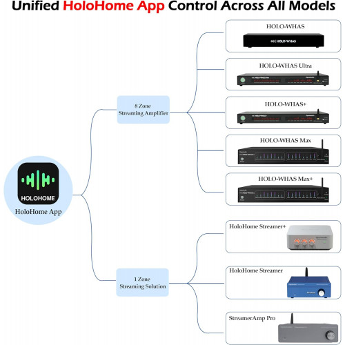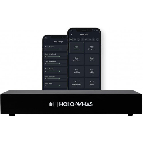 - Fácil configuración de red: proporciona una experiencia mejorada fuera de la caja (OBE), lo que permite a los usuarios configurar fácilmente la red HOLO-WHAS a través de una aplicación móvil sin necesidad de un punto de acceso WiFi. - La configuración está guiada, por lo que es simple y fácil de usar. Soporte multizona: soporta hasta 8 zonas de audio independientes simultáneamente. Permite reproducir diferentes contenidos de audio en diferentes salas o áreas, adecuado para hogares, espacios comerciales o salas de conferencias.