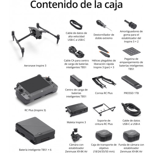 • Incluye: aeronave, cámara con estabilizador Zenmuse X9-8K Air, RC Plus (Inspire 3), batería inteligente TB51 ×6, centro de carga de baterías, PROSSD 1TB, maleta, hélices (par) ×3, etc.