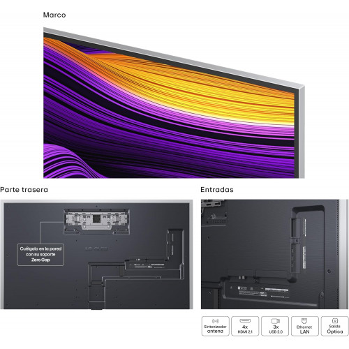 • Diseño Gallery ultrafino para una integración perfecta del TV en la pared gracias a su soporte exclusivo "Zero Gap" con instalación incluida.