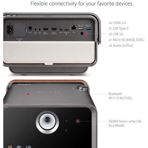 • PROYECTOR TODO EN UNO PARA JUEGOS Y ENTRETENIMIENTO EN EL HOGAR: disfruta de una experiencia de teatro en casa con una compatibilidad del 125% REC. 709, resolución Ultra HD 3840 x 2160 y soporte para contenido HDR y 3D