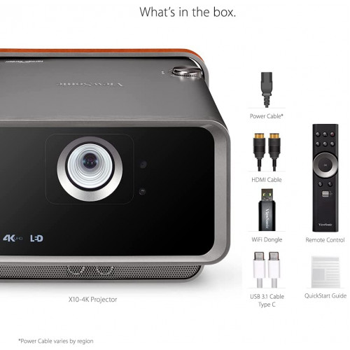 • LA CAJA CONTIENE: proyector X10-4K, cable HDMI, control remoto y baterías, guía de inicio rápido, cable de alimentación y dongle Wi-Fi