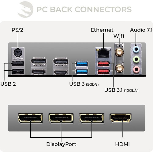 [DIMENSIONES (AN X AL X PR, CM)]: 2x USB 3.1 | 2x USB 3.0 | 2x USB 2.0 | 3x Display Port | 1x HDMI | 1x PS.2 | 2.5 Gigabit Ethernet LAN | Audio 7.1