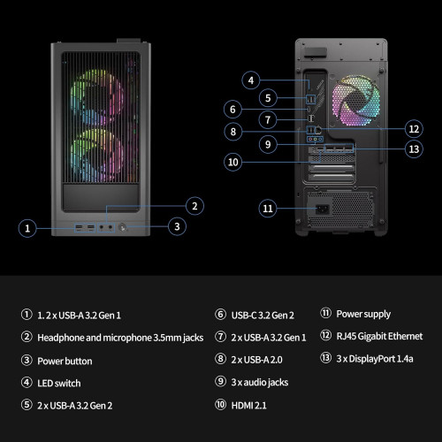 • Arquitectura térmica ARGB: diseñada a medida para un rendimiento silencioso con refrigeración por aire de triple ventilador y un enfriador de 150 W, además de ventilación de malla frontal para un flujo de aire óptimo. El panel lateral de vidrio sin herramientas resalta la iluminación RGB interna y crea una plataforma de juego visualmente impresionante