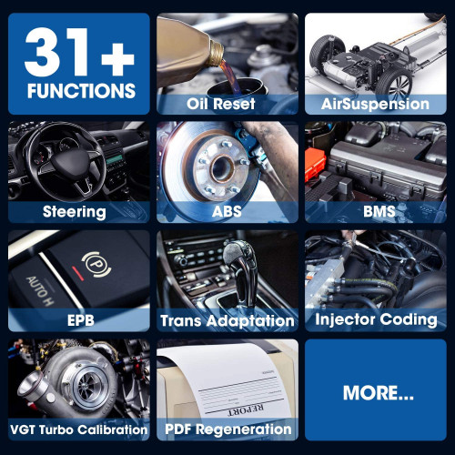 【Más de 25 SERVICIOS】MK906BT viene con más de 25 funciones de servicio, como Purga de frenos, SRS, SAS, Reinicio de aceite, EPB, BMS, inyector, DPF, etc. para satisfacer sus diversas necesidades.