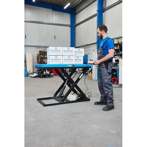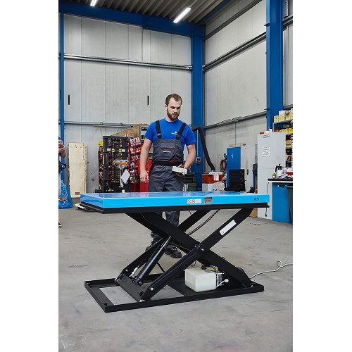 Gracias a su tamaño de plataforma generoso de: 1300 x 800 mm es la herramienta perfecta para levantar mercancías voluminosas y pesadas. La altura mínima de la plataforma es de sólo 190 mm, pero la mesa elevadora también puede empotrarse en el suelo si es necesario.En funcionamiento, puede ajustarse a una altura máxima de plataforma de 1010 mm.